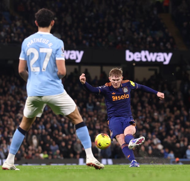 Newcastle’s gameplan depended on profiting from a moment to score. An example came when a Tonali free-kick was headed in by Burn but the centre-back was offside – pushed into the position by Rúben Dias, though afterwards Howe said he had not seen this. Dias’s sluggish pace had forced him to haul down Gordon for Tonali’s set piece, and he was booked, then substituted for the second period – tactically, Guardiola confirmed – the far quicker Abdukodir Khusanov coming on.